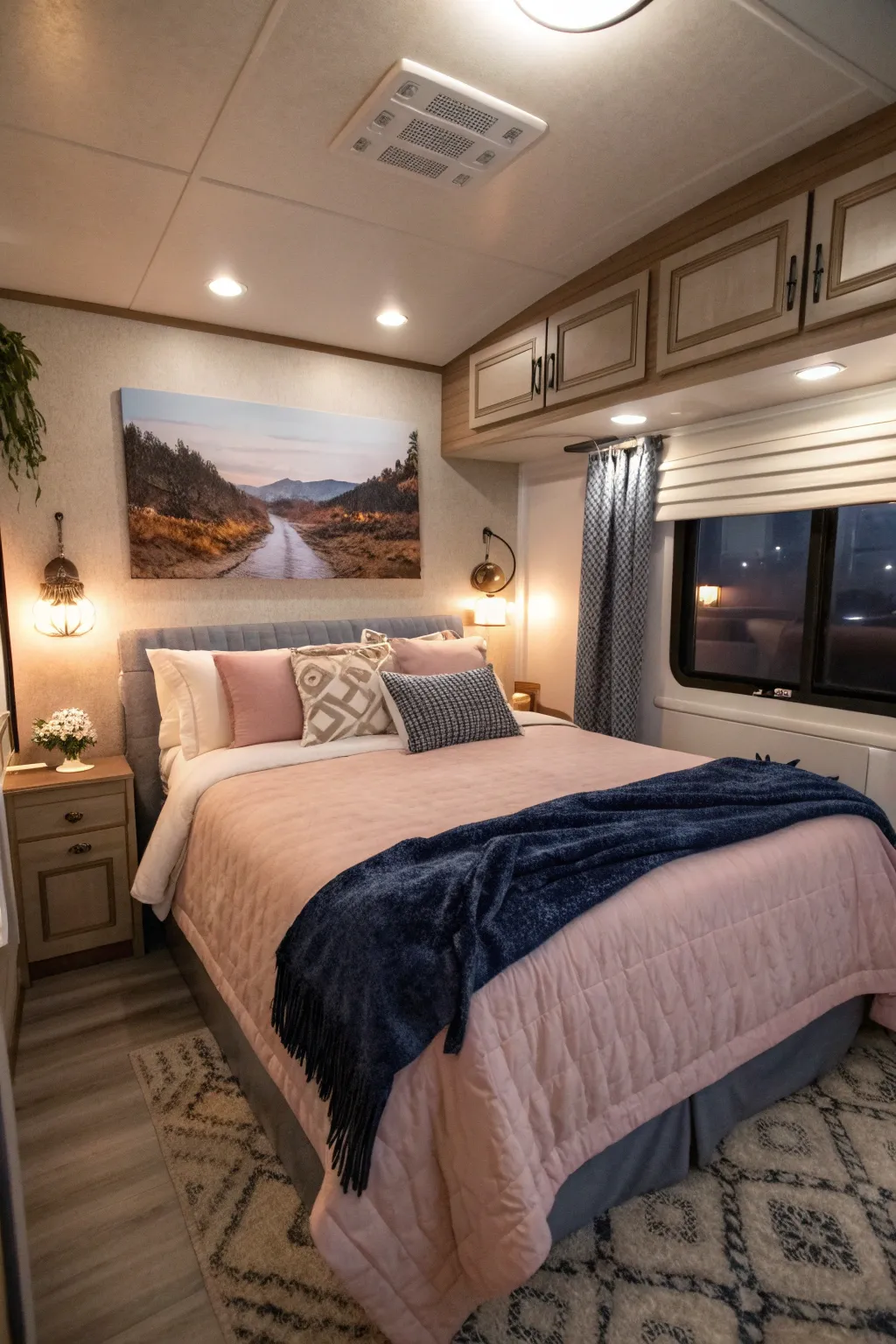 Introduce bold patterns through bedding or accent pillows to add visual interest. A client’s mobile home bedroom became a lively space with just a few patterned elements.