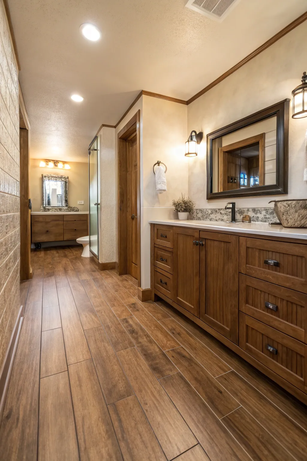 For a cozy, inviting feel, embrace rustic wood flooring. It adds character and warmth, making your bathroom feel like a retreat.