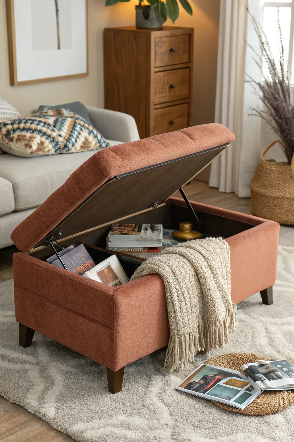 • Rectangular Storage Ottoman: Choose a stylish rectangular ottoman with storage to keep your living room organized effortlessly.