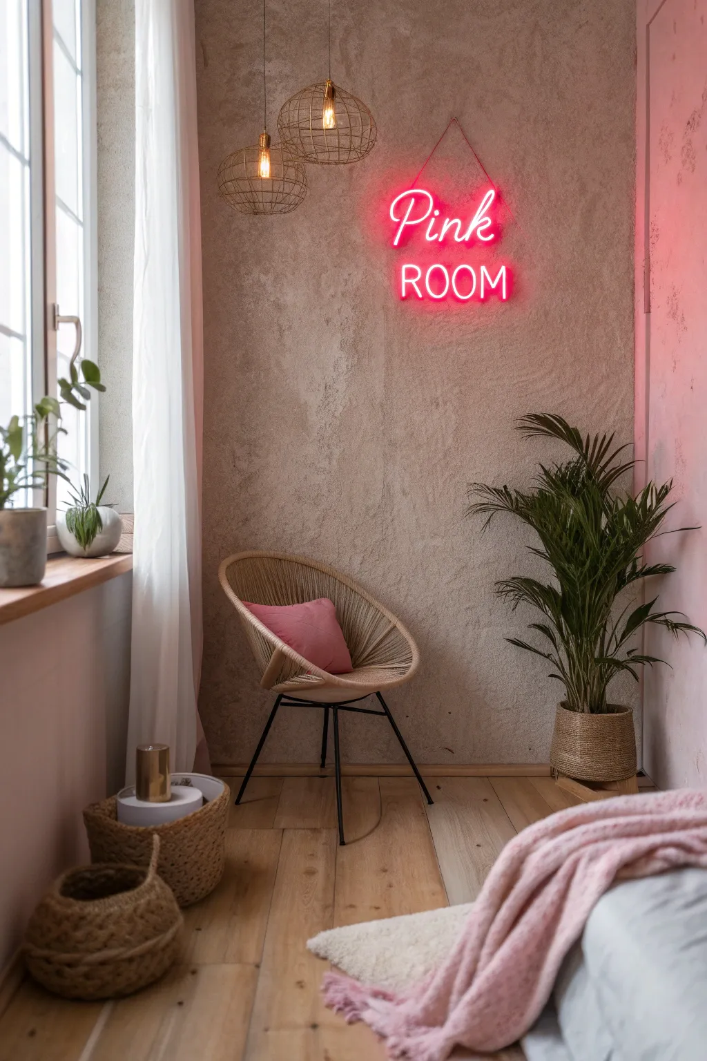 - Custom Pink Neon Sign: Add a personal touch with a custom pink neon sign for your room. Bring it to life.