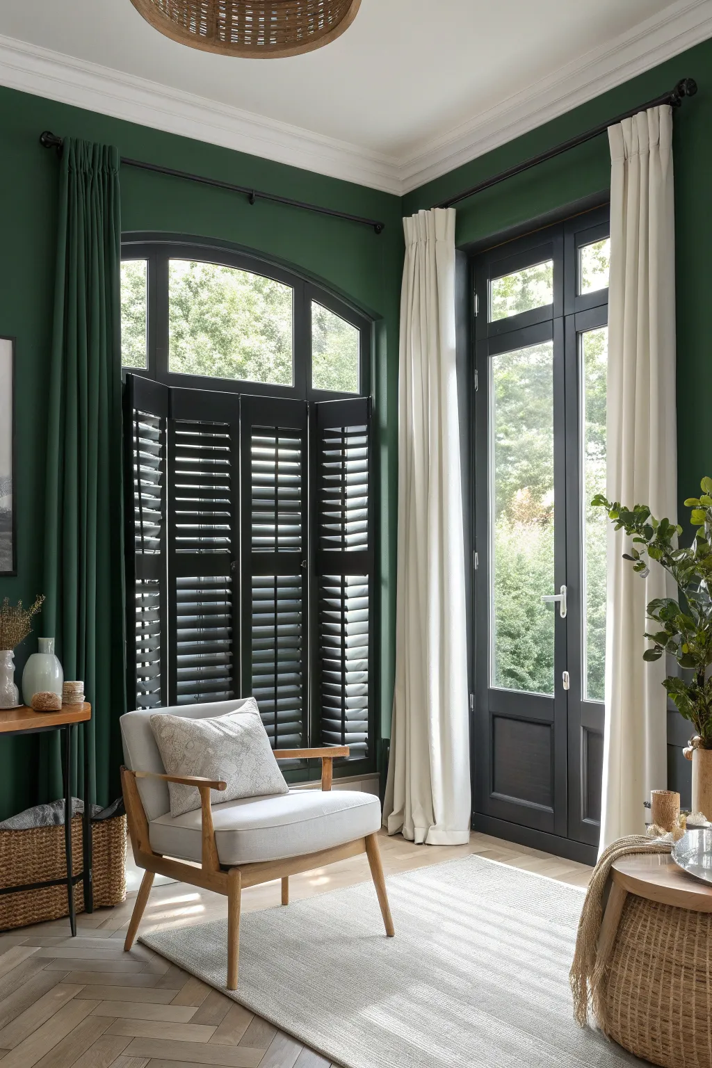 - Luxurious Green Curtains: Pair your shutters with luxurious green curtains for a rich, cohesive color scheme.