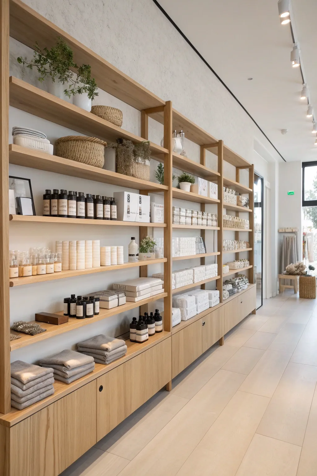 - Natural Wooden Wall Shelves: Enhance your retail space with natural wooden wall shelves for a cozy, inviting look.
