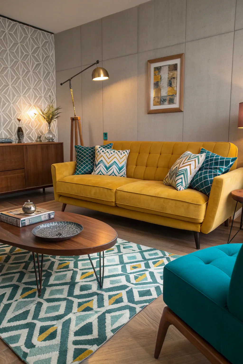 Let your living room burst with energy through bold colors and patterns that echo retro vibes.