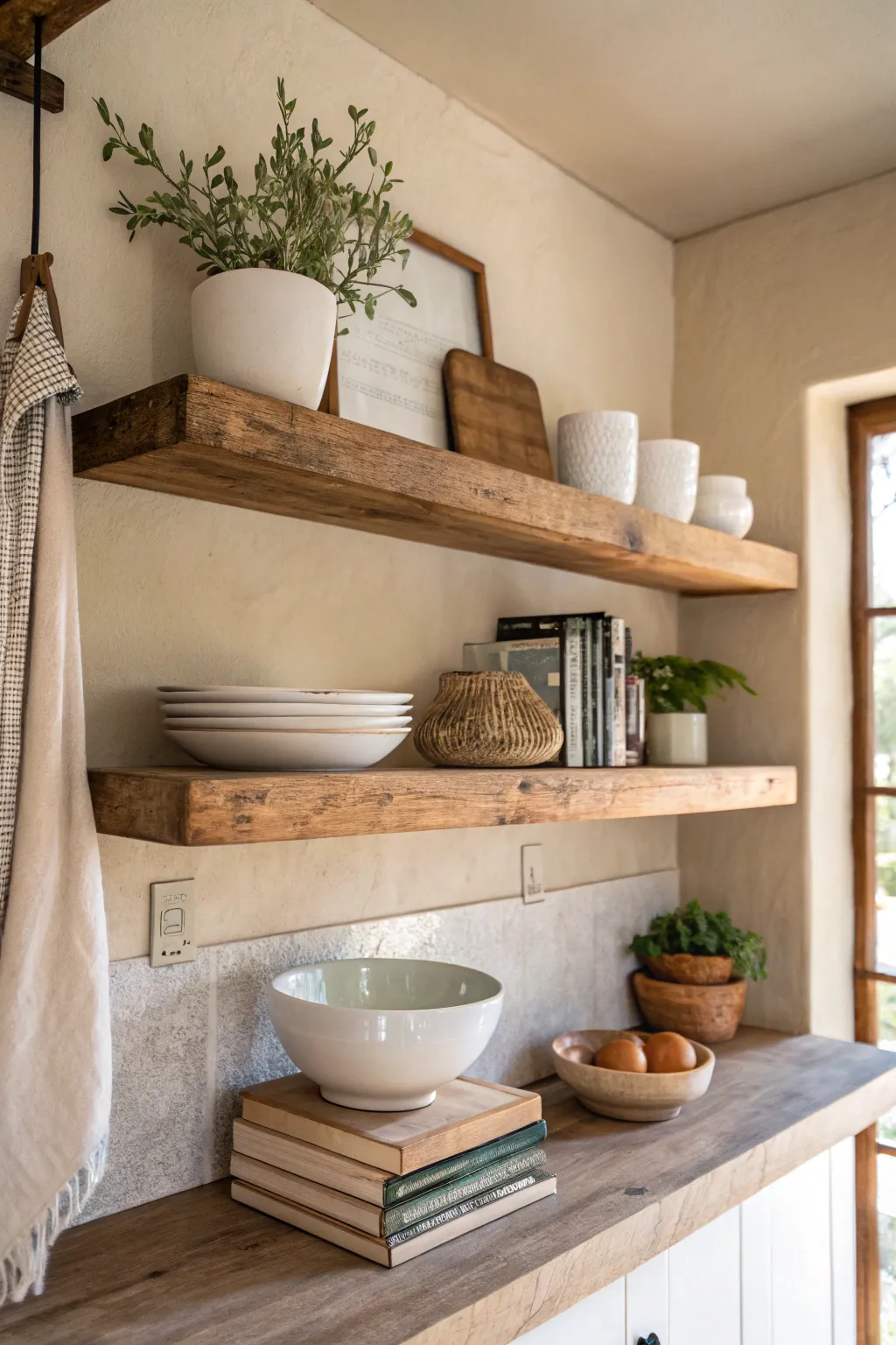 - Rustic Floating Wood Shelves: Enhance your kitchen with these rustic floating wood shelves for a perfect blend of style and utility.