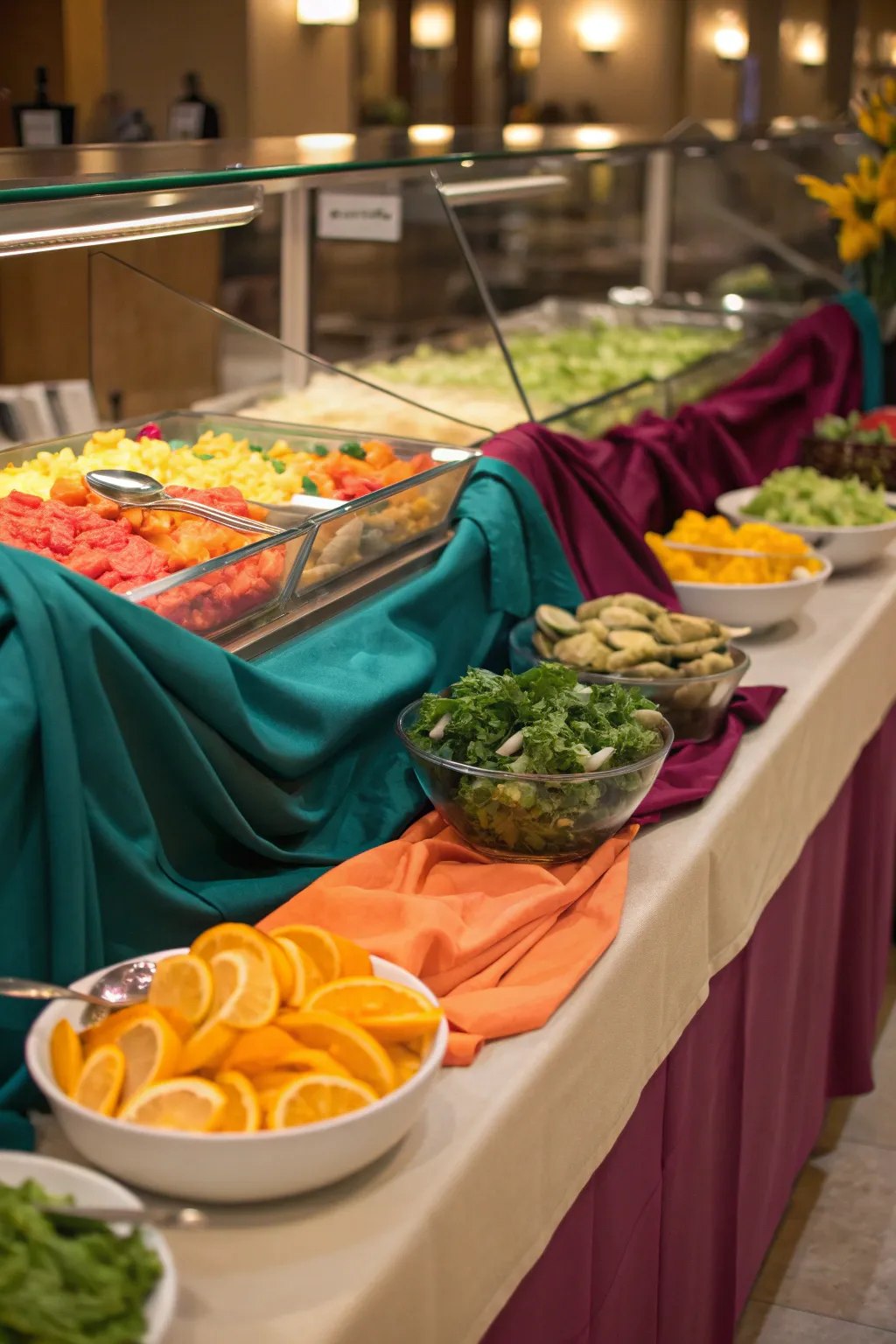 Use vibrant table linens to enhance the look of your salad bar. I love how a pop of color can transform the entire presentation.