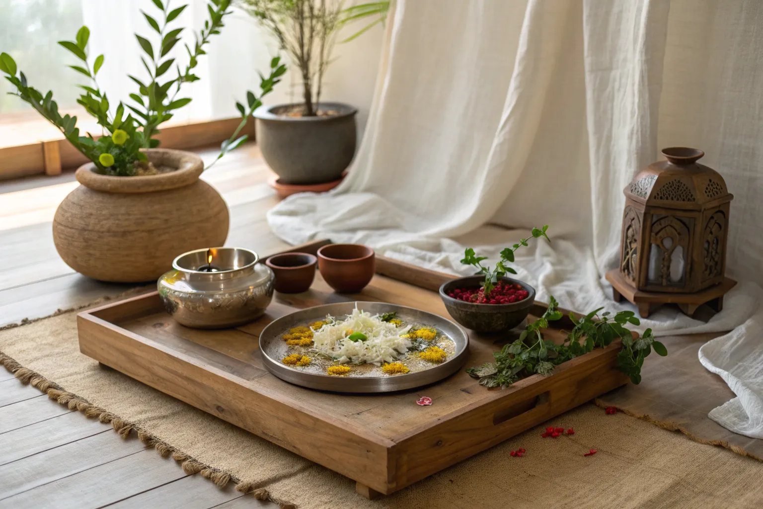 Opt for a minimalistic setup with a few key elements to keep the focus on the ritual. This approach creates a peaceful and uncluttered atmosphere.
