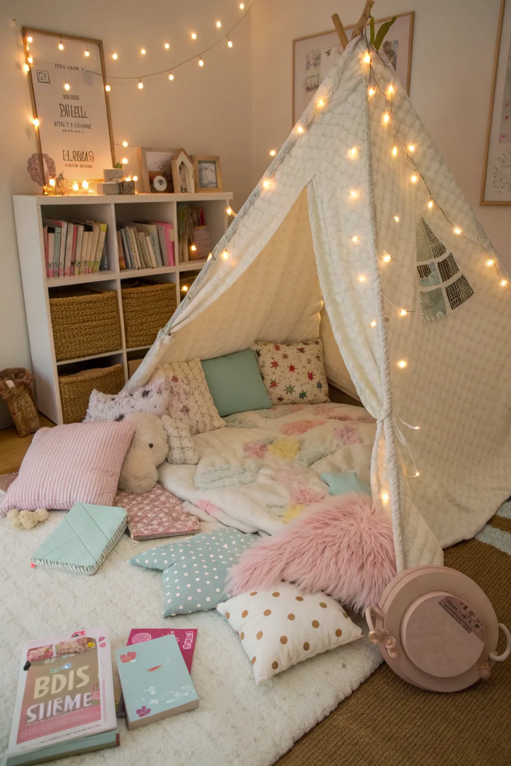 Create a dreamy retreat with indoor teepees adorned with twinkling lights. #SleepoverMagic #CozyCorners