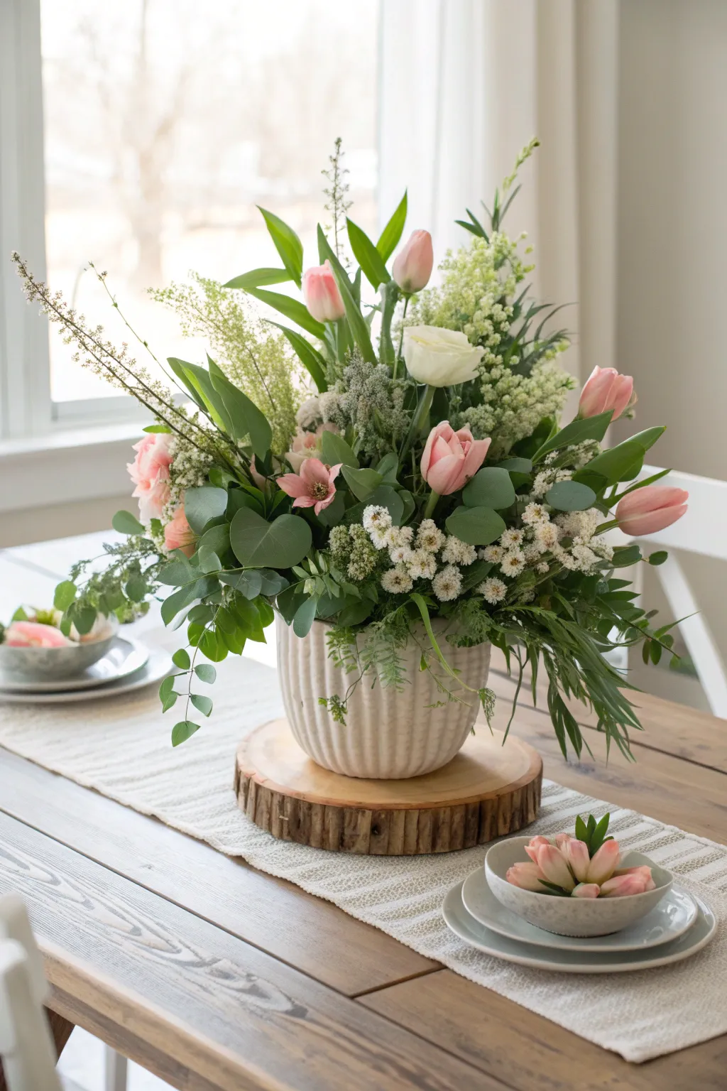 Combine artificial flowers with lush greenery to mimic the freshness of a spring garden. It’s a trick I’ve used to keep my home feeling vibrant all year round.