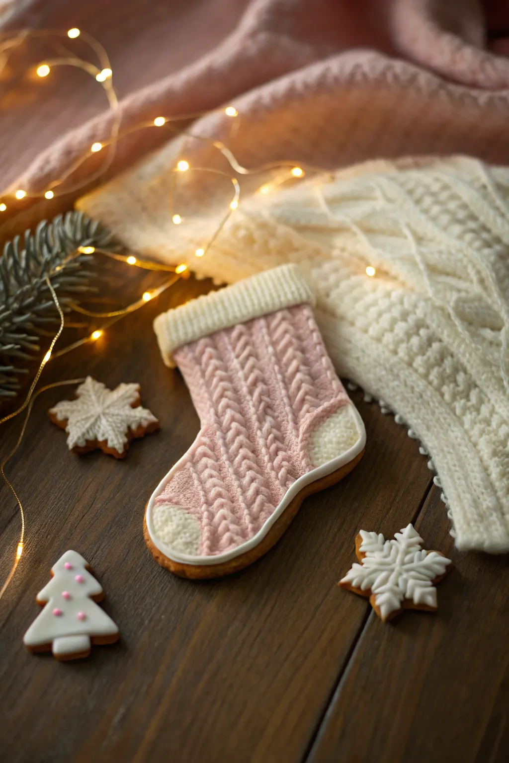 Create a cozy feel by piping a knit texture onto your stocking cookies. It’s a charming way to bring the warmth of a knitted stocking to your edible creations.