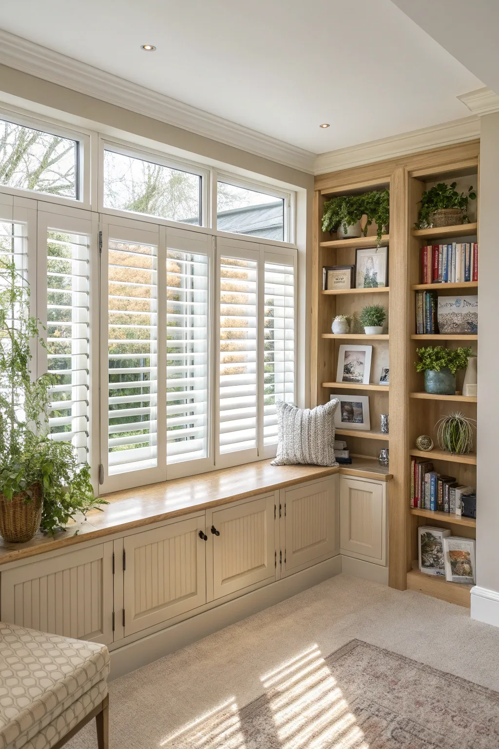 - Space-Saving Shutters and Shelf Combo: Optimize your sunroom with space-saving shutters that elegantly incorporate built-in shelving.