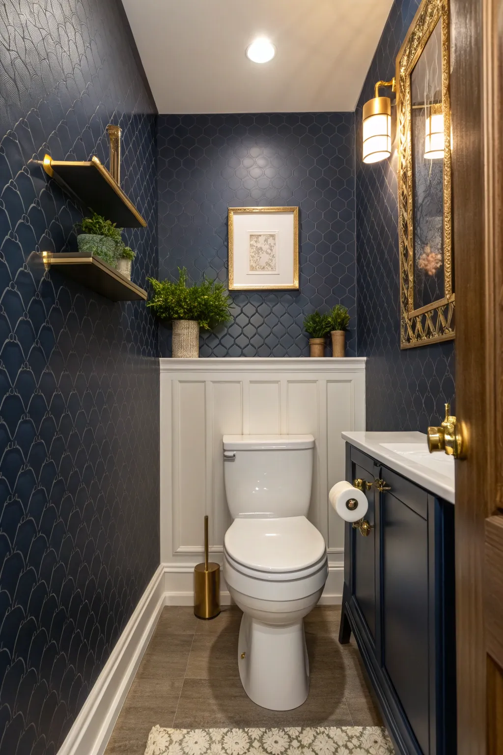 Create a focal point in your bathroom by using bold paint colors or vibrant wallpaper behind the toilet. In one of my projects, a deep navy wall added a touch of elegance and depth to the space.