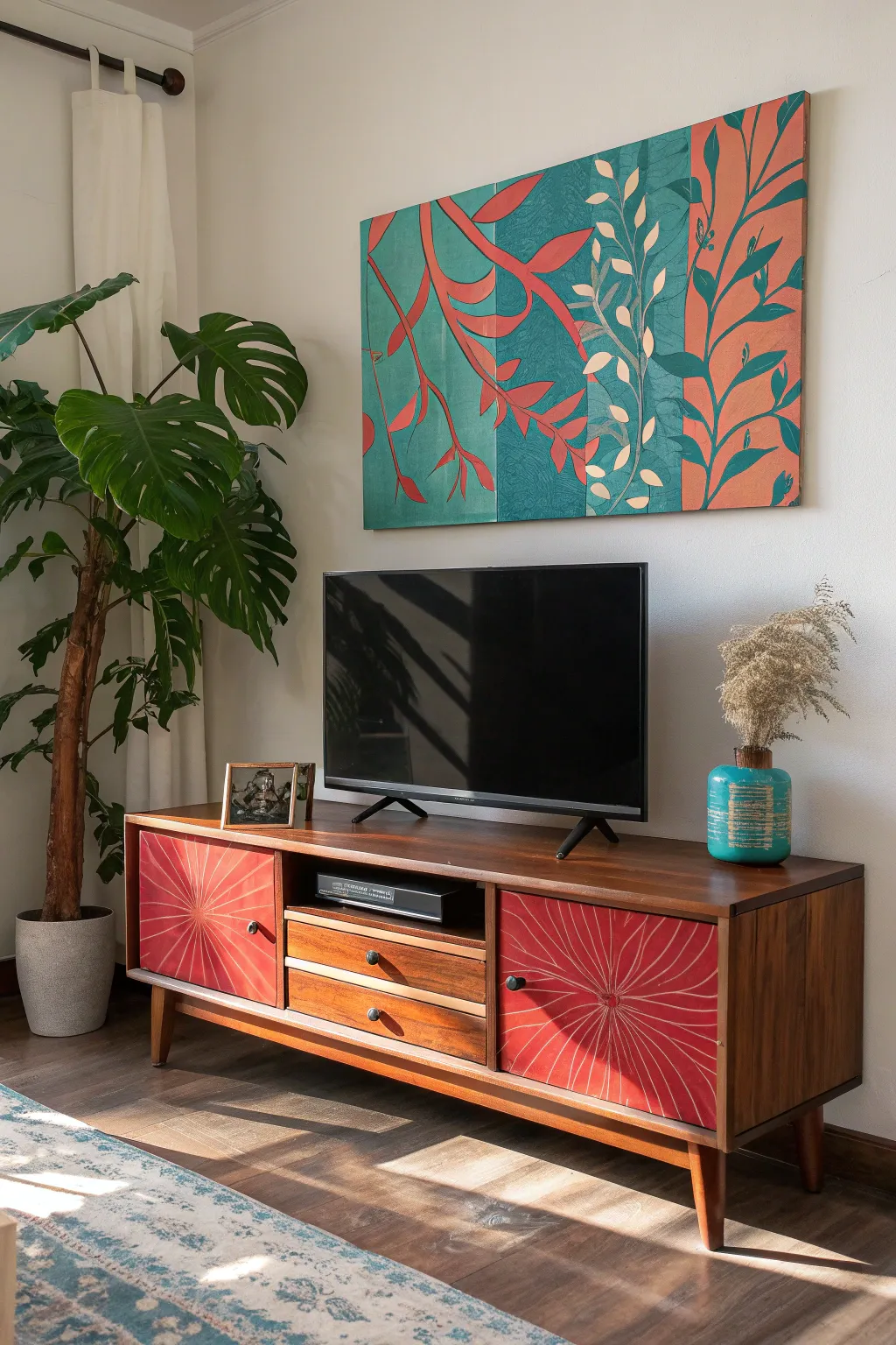 - Colorful Geometric TV Console: Revitalize your space with a vibrant console, showcasing daring colors and intricate patterns.