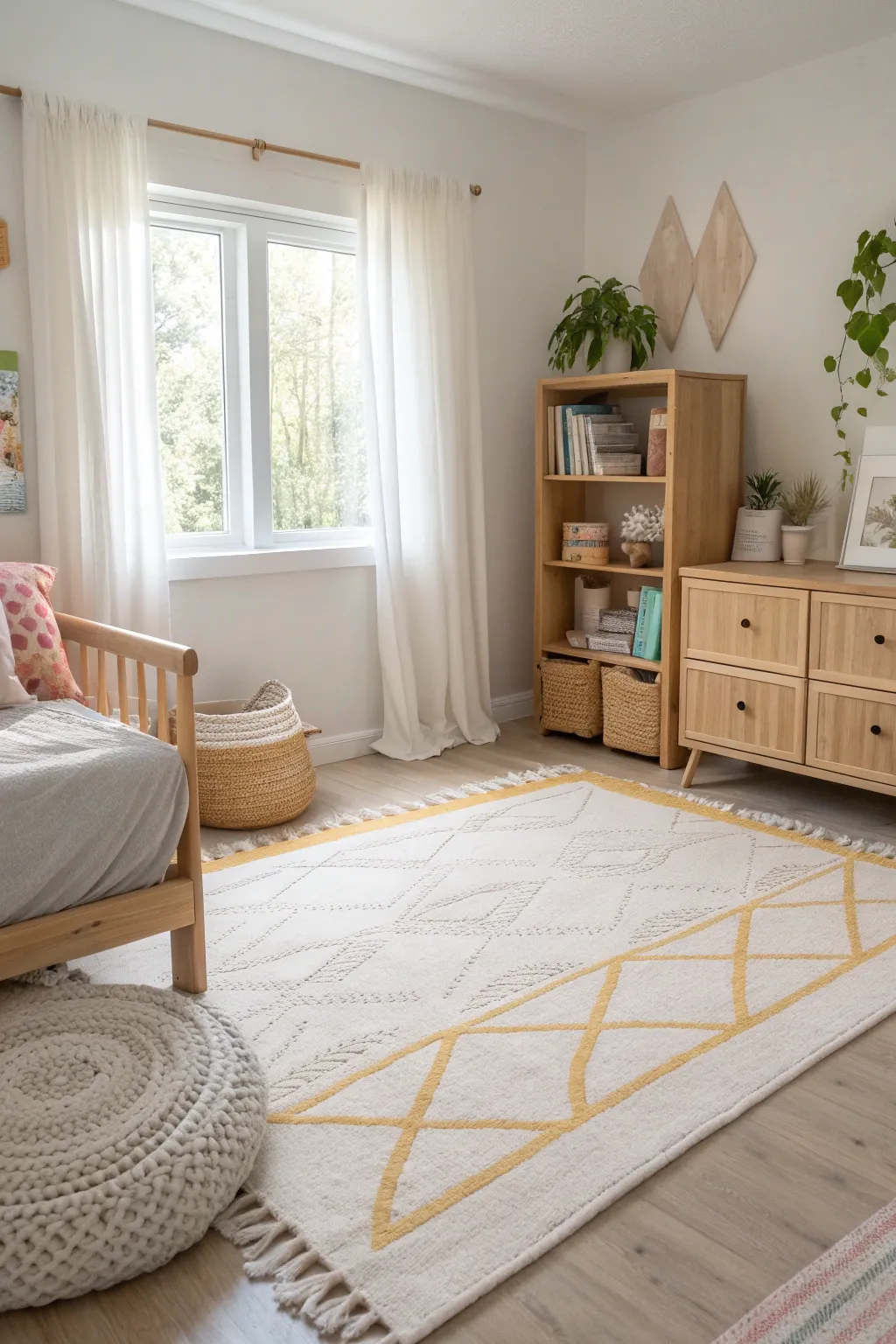 - Pastel Rug with Geometric Patterns: Brighten your floor space with a pastel rug featuring charming geometric patterns.