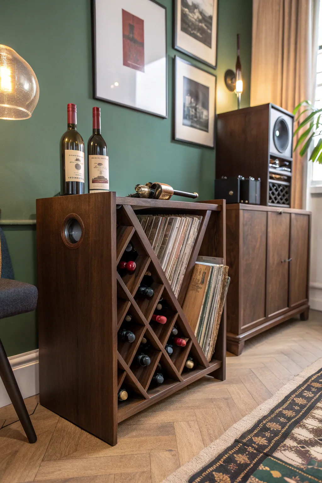 Get creative by repurposing a wine rack for vinyl storage. It’s a unique way to blend functionality with an unexpected twist.