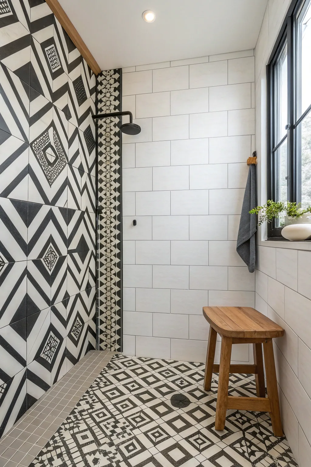 - Black and White Geometric Shower Tiles: Enhance your shower with these bold geometric tiles for a timeless, stylish transformation.