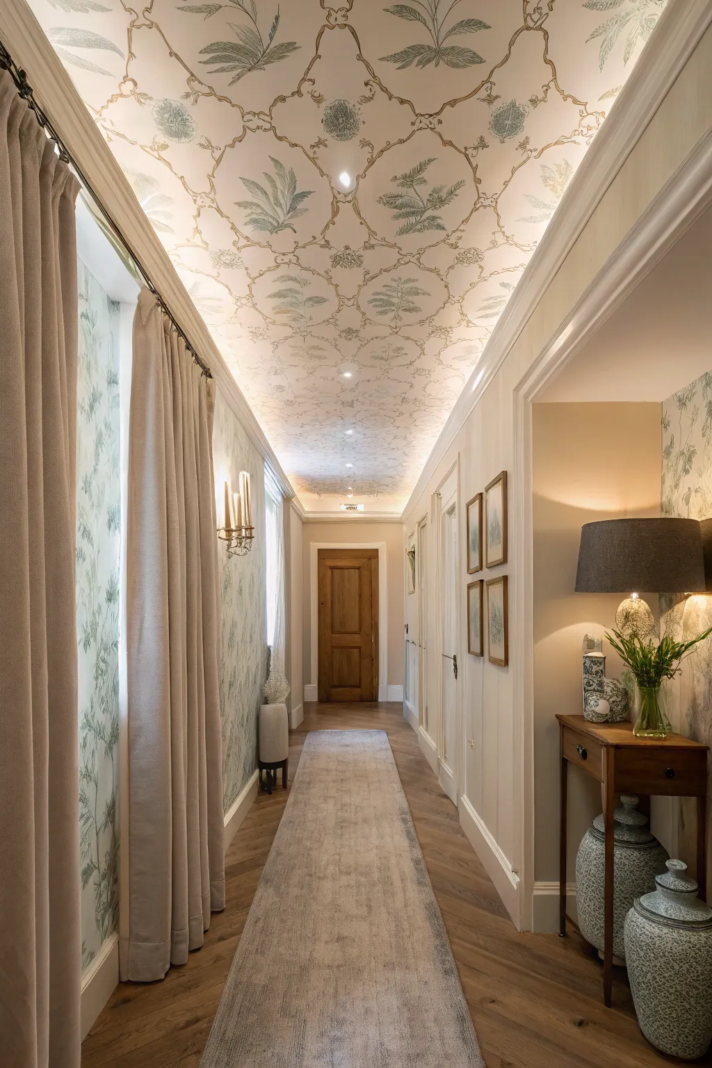 Turn your hallway into a welcoming path with subtle, muted patterns on the ceiling. It sets the mood as soon as you walk in.