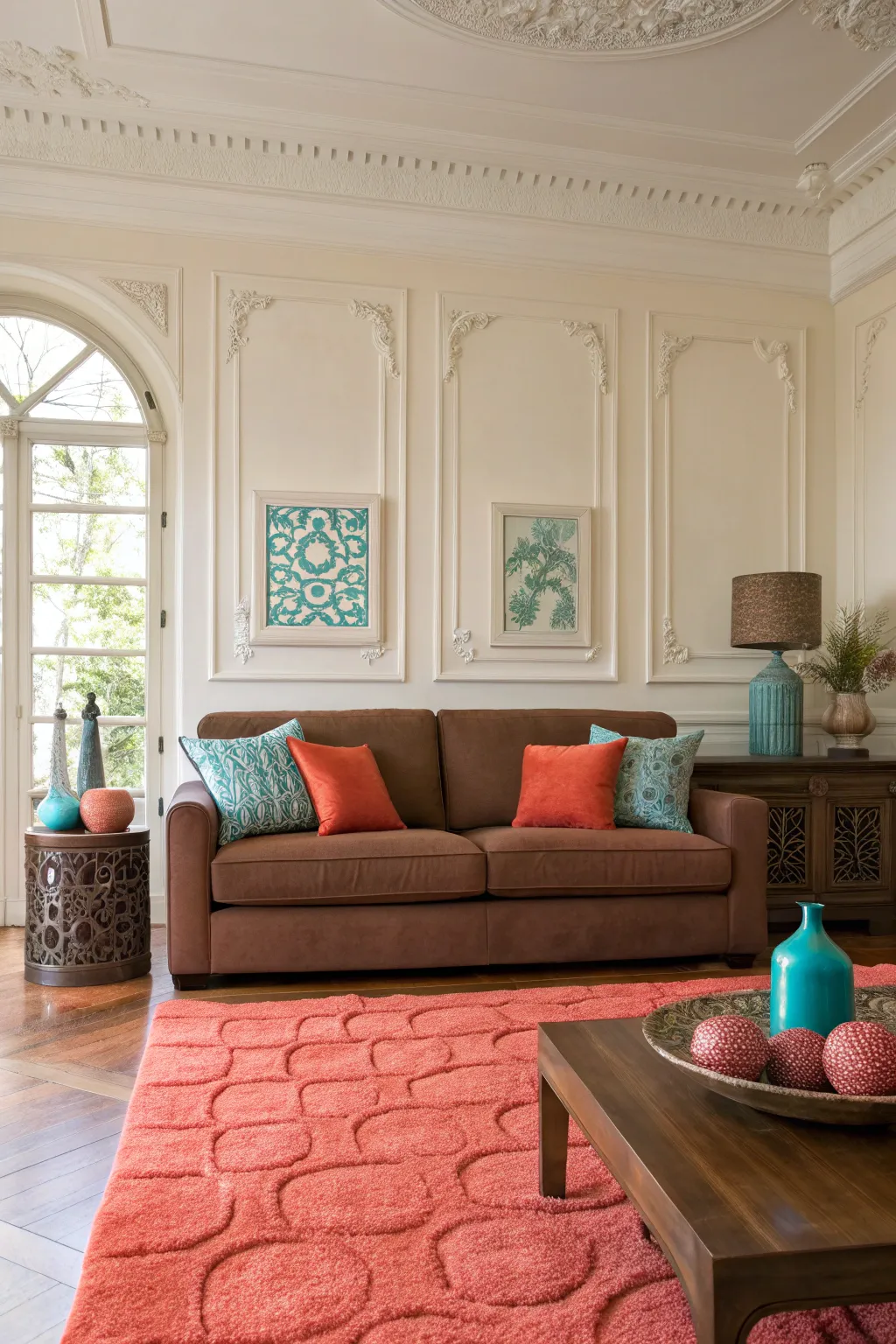 A teal accent wall can make a bold statement, enhancing the richness of brown furniture with its vibrant hue. This color pairing exudes confidence and style.